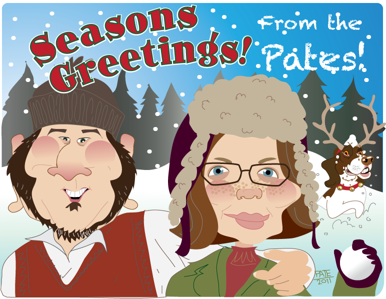 In the meanwhile, once again I am offering greeting card/gift caricatures for a special rate for the holidays. $50 gets you a full color digital drawing of 2 people, head and shoulders, a simple background and a holiday message. Extra people, bits and backgrounds are $25 each. Hit me up if you want one! Here’s ours from a few years ago.